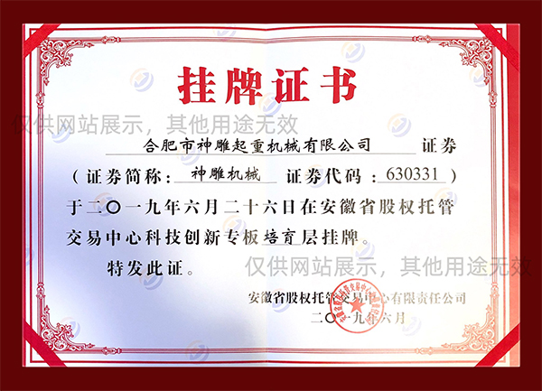 合肥神雕起重是高新技術企業,是安徽省科創(chuàng)板掛牌企業(證券代碼:630331),同時榮獲安徽市場質量、誠信五星級企業、合肥經濟圈示范企業、合肥市創(chuàng)新型企業、安徽省市場質量放心產品等榮譽稱號